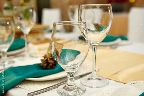 Festive table setting in the restaurant with flowers. Wedding decor.