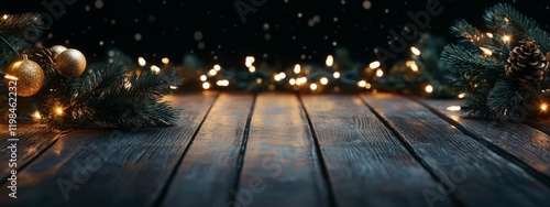 christmas, winter, holiday, festive, decor, light, garland, ornament, pine, wood, table, background, scene, design, bokeh, dark, night, sparkle, magic, celebration, cosy, rustic, christmas, tree, tree branch, gold, cone, snow, blurry, abstract, texture, image