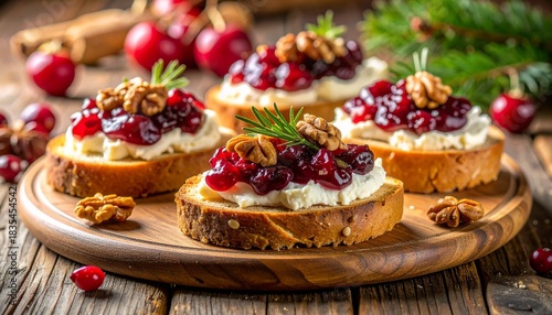 crostini, festive, christmas, cranberry, cheese, walnut, appetiser, rustic, seasonal, winter, holiday, snack, finger food, epicure, red, gold, wooden board, tasty, crunchy, creative, enjoyment, celebrate, decoration