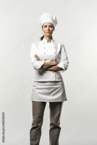 Fictional Caucasian Female Chef in her uniform against a white background - Created with Generative AI Technology
