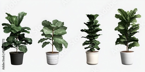 Fiddle leaf fig plants in modern pots, showcasing their broad green leaves against a white background.