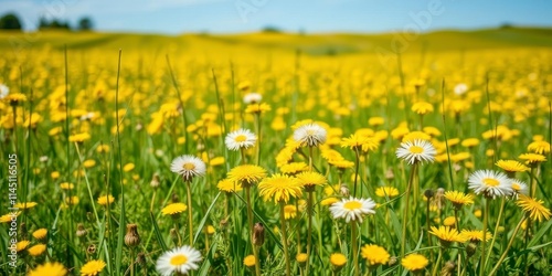 Field of vibrant dandelions under a clear blue sky, flowers, blue sky