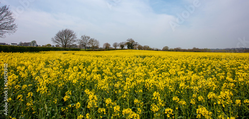 england, countryside, crop, farming, field, rapeseed, tree, water tower, yellow