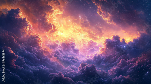 fiery core illuminates billowing clouds in shades of orange and purple in a stunning sky spectacle
