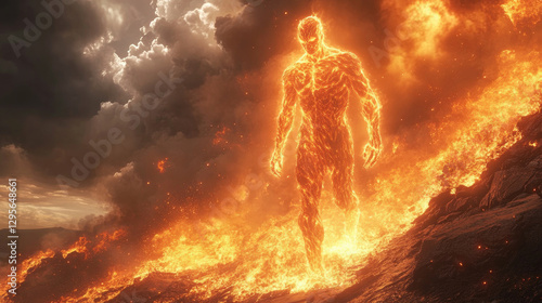 fire, flames, inferno, man, human, figure, walking, mountain, volcano, landscape, sky, cloud, storm, heat, lava, magma, mythical, creature, god, daemon, supernatural, fantasy, epic, digital, art, illustration, graphic, design, orange, red, light, energy, power, destruction, chaos, burning, apocalyptic, hell, fiery, blazing, hot, powerful, ancient, legend, story