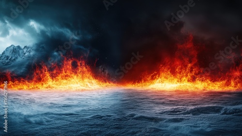 fire, ice, contrast, flames, snow, landscape, nature, dramatic, weather, extreme, heat, cold, sky, mountain, smoke, energy, beauty, visual, high-coloured, surreal, scene, environment, texture, coldness, warmth, horizon, dark, light, abstract, fiery, icy, atmospheric, dense, phenomena, frost, tension, striking, colourful, composition, spectacular, scenic