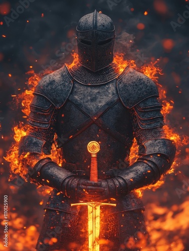 knight, armoring, sword, fire, flames, warrior, battle, strength, courage, mediaeval, fantasy, epic, hero, glowing, fierce, darkness, light, protection, power, ancient, historical, majestic, dramatic, art, character, silhouette, texture, emotion, conflict, metal, symbol, story, combat, heroism, legend, mystery, shadow, fortitude, intensity, fighting, adventure, cinematic, concept, illustration, scene, environment