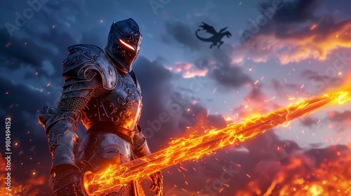 knight, epic, flaming, sword, battle, fantasy, dragon, armoring, illustration, fire, power, strength, game, warrior, cinematic, digital, mediaeval, fight, dark, dramatic, bravery, concept, art