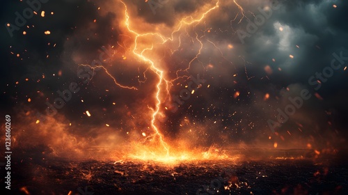 lightning, strike, fire, ember, dark, landscape, storm, cloud, night, sky, fiery, hot, inferno, blaze, flames, spark, energy, power, electricity, thunder, dramatic, intense, apocalyptic, hellish, ominous, mystical, magical, volcanic, eruption, ground, earth, ash, smoke, glowing, orange, yellow, red, black, texture, background, scene, image
