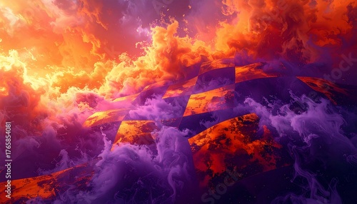 Fiery orange clouds swirl over a checkered landscape, bathed in purple mist