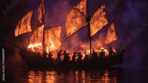 pirate ship, sailing vessel, ocean, night, fire, flames, dark, silhouette, crew, adventure, sea, water, orange, purple, smoky, dramatic, mysterious, historical, sailing, torch, burning, mast, rigging, voyage, journey, nautical, dark sky