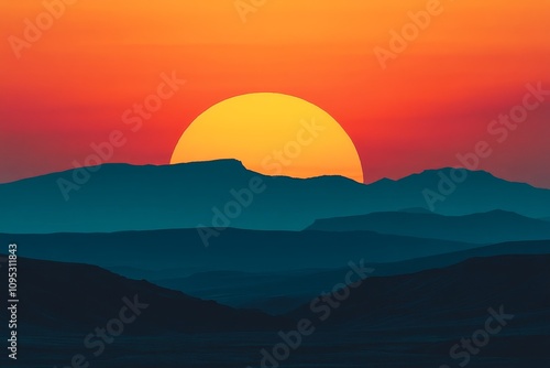 Fiery Sunset Over Majestic Mountains - Vibrant sunset, large sun, silhouettes of mountains, peaceful landscape, fiery colors. Evokes tranquility, warmth, and nature's beauty.