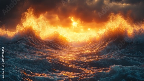 ocean, wave, sunset, sea, water, storm, fire, dramatic, sky, cloud, gold, orange, fiery, nature, landscape, power, energy, wild, intense, beauty, scene, seascape, vista, view, horizon, glow, light, colours, high-coloured, spectacular, breathtaking, amazing, awesome, magnificent, impressive, dynamic, powerful, turbulent, rough, choppy