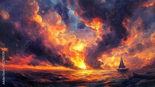 sunset, ocean, sailboat, cloud, fire, sky, dramatic, sea, boat, orange, red, dark, night, water, painting, art, digital, illustration, high-coloured, colours, fiery, intense, landscape, nature, scene, travel, adventure, calm, serene, peaceful, hope, journey, voyage, horizon, twilight, gold, light, bright, huge, expanse, solitude, freedom, romantic, beauty, artistic, creative
