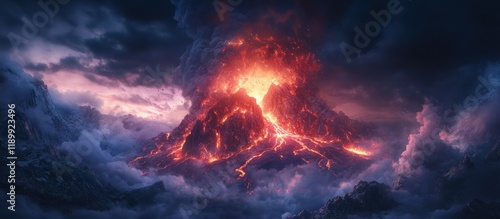 Fiery volcanic eruption amidst dramatic, dark clouds and mountain peaks.