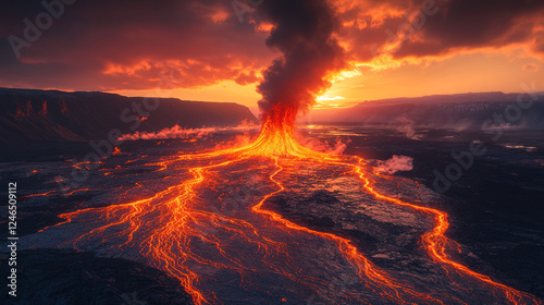 Fiery Volcanic Eruption Lava Flow Dramatic Sunset Landscape Iceland Hot Red Sky Fire Rock Heat Black