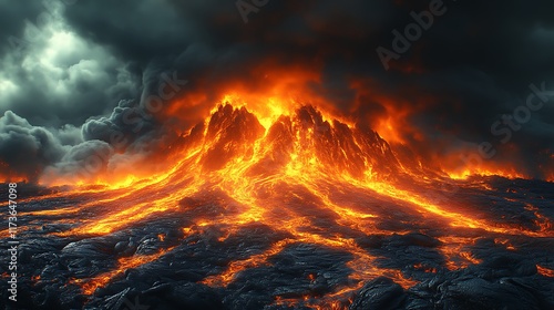 volcano, eruption, lava, fire, magma, mountain, rock, dark, cloud, storm, smoke, heat, hot, fiery, inferno, hellish, dramatic, intense, power, nature, landscape, scenery, geologic, disaster, catastrophy, destruction, apocalypse, danger, hazard, threat, extreme, wild, powerful, energy, force, texture, background, illustration, digital, art, image, photo