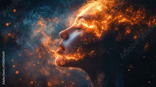 woman, fire, smoke, dark, fantasy, profile, art, portrait, mystical, flames, girl, beauty, head, hair, face, energy, power, passion, emotion, mysterious, magical, spiritual, abstract, surreal, creative, imagination, concept, design, digital, artwork, illustration, photo, texture, light, spark, ember, cosmic, glowing, intense, vibrant, burning, incandescent