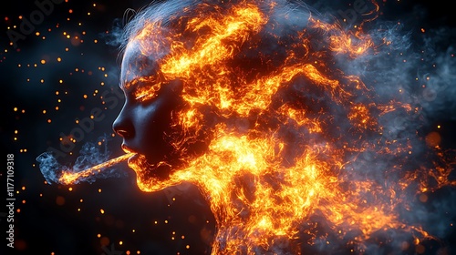 fire, woman, smoke, smoking, addiction, abstract, art, dark, background, head, girl, burning, flames, cigarette, danger, health, risk, image, concept, design, illustration, graphic, digital, photo, picture, visual, effect, creative, style, face, portrait, human, body, energy, passion, power, intensity, symbol, metaphor, surreal, imagination, fantasy, mystical, mysterious