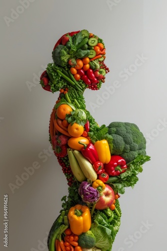 Figure of a girl made from vegetables and fruits, promotion of healthy eating, Generative AI.