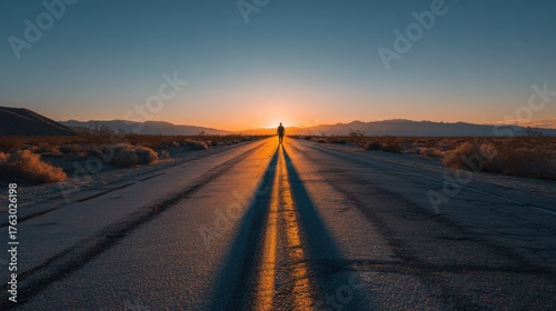 man, road, sunset, shadow, desert, horizon, landscape, silhouette, asphalt, orange, yellow, blue, sky, mountain, hill, shrub, dry, dusk, dawn, pathway, long, stretching, solo, figure, standing, lone, empty, huge, outdoors, travel, journey, destination, end, beginning, hope, light, warmth, contrast, perspective, gravel, cracked, edge, distant, wilderness, nature