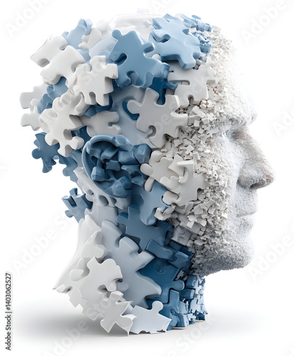figure, puzzle, piece, floating, head, mental, health, solving, symbolic, concept, brain, mind, therapy, psychology, emotional, healing, introspection, thinking, awareness, struggle, recovery, support, clarity, identity, mindfulness, resilience, confusion, breakthrough, solution, growth, trauma, depression, anxiety, illustration, abstract, conceptual