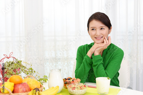 woman, people, food, drink, meal, fruit, sweet, milk, yogurt, cereal, breakfast, snack, woman, adult, young, sweet, clean, meal, drink, delicious, mealtime, eatery, expression, dish, diet, calorie, cosmetic, alimentation, health, smile, smile, happy, beauty, model, girl, fun, lifestyle, lively, person, alone, okinawa, japanese, asian, copy space, waist up