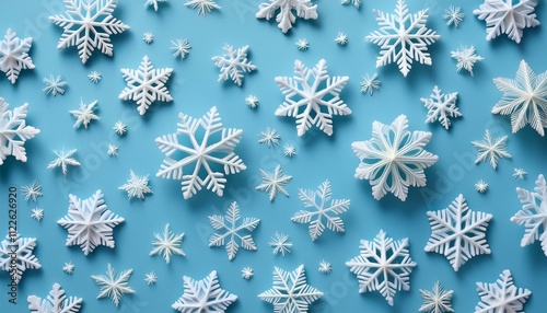 落ち着いたパステルブルーの背景に、小さめの白いスノーフレークがランダムに散りばめられ、シンプルな雪景色が広がるテクスチャ。