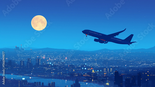 city, horizon, building, urban, city landscape, night, sky, architecture, town, business, skyscraper, illustration, silhouette, moon, landscape, art, downtown, light, design, view, blue, street, construction, plane, plane, jet, travel, flight, tuneful, transportation, fly, airfield, aerial, transport, flying, landing, airliner, fare, take off, commercial, cloud, vacation, freight