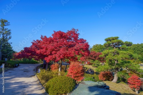 青空バックに見る真っ赤なモミジの紅葉と見事な枝ぶりの松のコラボ情景
