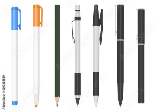 pen, ball pen, lead pencil, marker, marker, tool, stationery, school, training, office, work, equipment, equipment, illustration, vector, icon, isolated, object, business, write, art, writing, set, ink