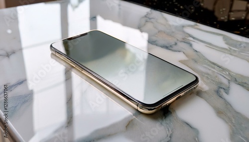 대리석 상판 위에 스마트폰이 놓여 있고, 화면에 빛이 반사되고 있다