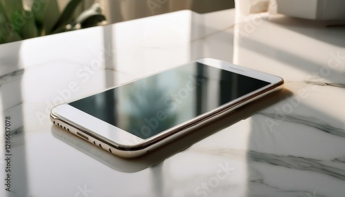 대리석 상판 위에 스마트폰이 놓여 있고, 화면에 빛이 반사되고 있다