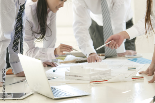 people, japanese, youth, business, businessman, office, fresh, newcomer, meeting, meeting, hand, team, teamwork, recruit, man, woman, cooperation, cohesion, oneness, colleague, fellow, personal computer, notebook, personal computer, model, architecture, property, plan, planning, drawing, design, design, drawing, indoor, indoor, copy space, suit