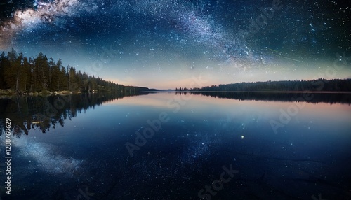 夜空の星が湖面に映り込み、静謐な宇宙の広がりと自然の神秘を感じさせる情景