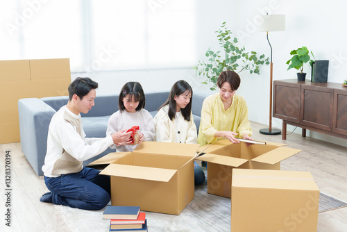 family, family, move, relocation, packaging, packing, preparation, new life, disposal, recycling, assortment, packing, baggage, container, cardboard, trimming, children, girl, sister, assistance, assist, woman, man, woman, daughter, japanese, asian
