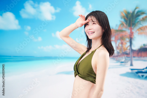 blue skies, beach, swimwear, missy, summer, resort, sea, sun, travel, vacation, beach, nature, vacation, relax, smile, wave, healthy, landscape, sea breeze, summer getaway, tropical, refreshing, happy, journey, liberty, wind, amusement, man, woman, asian, japanese, chinese, korean, copy space