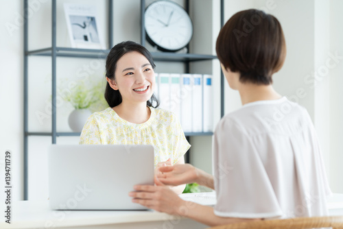 consultation, version, proposal, refer, counseling, woman, young, smile, speaking, conversation, hear, casual, office, office, table, waist up, face, planner, adviser, consultancy, guidance, adviser, business, copy space, indoor, two people, smiling, sitting, lifestyle, person, smile, indoor, look, thought, contemplate, personal computer, notebook, computer
