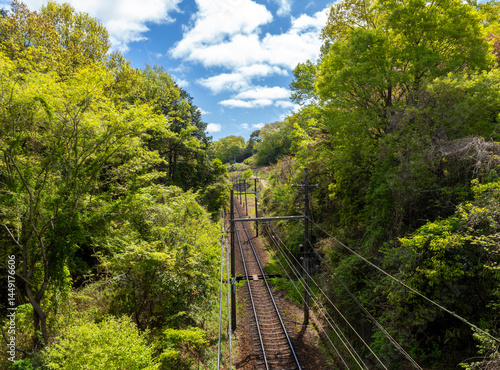 rail, wood, verdure, green, plant, leaf, route, blue skies, sunny, spring, unmanned, japan, landscape, rail, nature, transportation, mountain, view, rail, green