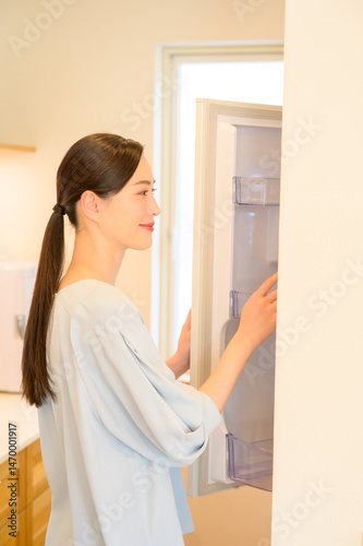 冷蔵庫を開けて中を確認する女性が微笑む日常の一場面