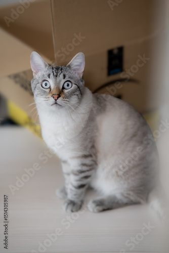 cat, grey, cardboard, indoor, eye, hair, expression, pattern, surprised, seated, barbed, ear, light, regard, cardboard box, domestic cat, cat, animal, pet, felino, sweet, domestic, fur, portrait, white, mammal, nature, young, fluffy, tabby, red, whisker, hair, green