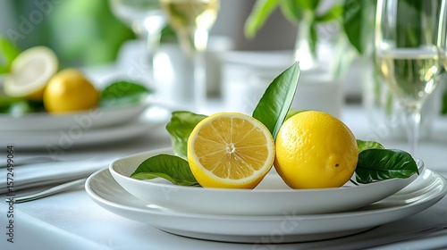 エレガントな白いお皿に盛り付けられたフレッシュなレモン。夏にぴったりの鮮やかなテーブルセッティング
