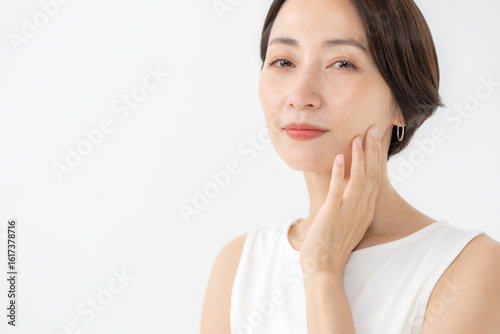 asian, japanese, woman, short hair, 30s, beauty, beauty, skincare, up, lifestyle, smile, pretty, latex, cosmetic, toilet water, ultraviolet, cosmetic, este, skin, measure, ol, homemaker, penetration, black hair, white background, cheek, nose, touch