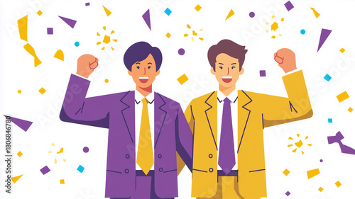 japanese, man, suit, cravat, purple, gold, businessman, crop, smile, fist, victory, enjoyment, fruition, fellow, cooperation, teamwork, colleague, pair, background, star, confetti, business, corporation, friendship, partner, event, celebration, motivation, hustle, vector, illustration, design, poster, badge, stacker, graphic, cheer, success