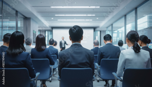 モダンなオフィスでセミナーを受講する観客の背面と、上部に広いコピースペースがあるビジネス背景素材