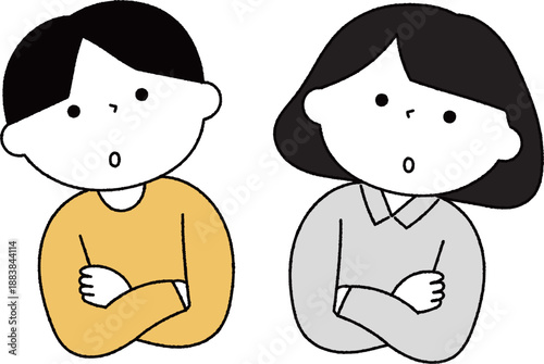 腕組みをして考える男の子と女の子単色