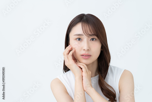 skincare, woman, skin, cosmetic, health, health care, white background, japanese, people, beauty, lifestyle, pointer, waist up, face, beauty, 30s, white, facial, copy space, casual, young, white, long hair, pretty, boredom, felt, cheek, bare skin, missy, thought, woman, person, beauty, model, thought