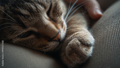 膝の上で眠る保護猫の顔と肉球を接写で捉えた信頼の瞬間
