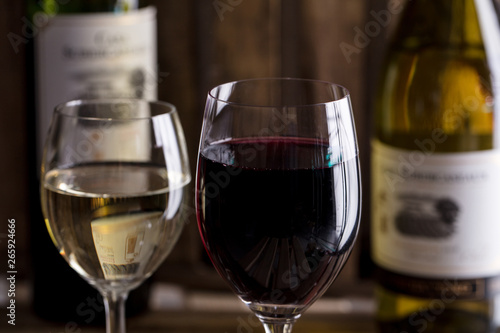 木の背景で赤ワインと白ワインのボトルとワイングラスがオシャレにおいてあるワインバー