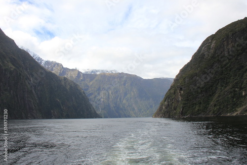 fiord, world heritage, new zealand, oceania, sea, water, bay, port, mountain, wood, forest, rock, rock, rock, sky, blue skies, weather, sunny, cloud, nature, green, grey, white, gradation, landscape, view, background, wallpaper